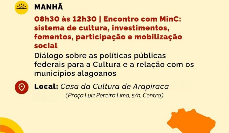 O projeto Circula Minc, iniciativa do Ministério da Cultura que promove formações itinerantes para agentes culturais, chega a Arapiraca nesta quarta-feira (25), a partir das 8h30, na Casa da Cultura, localizada na Praça Luiz Pereira Lima. O objetivo do encontro é fortalecer os produtores culturais locais e aprofundar o conhecimento sobre políticas públicas voltadas ao setor.