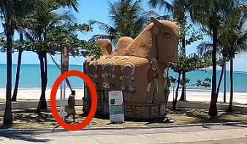 As imagens também mostram o suspeito circulando nas imediações da escultura pouco antes do incêndio, o que reforça os indícios de sua participação na ação criminosa.
