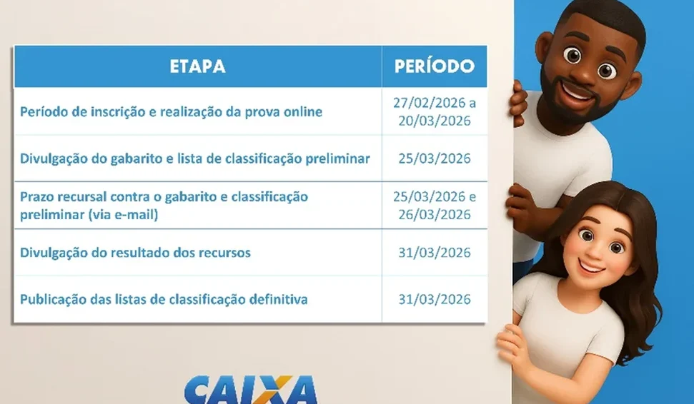 A CAIXA, em parceria com a Super Estágios, lançou novo processo seletivo de estágio em várias regiões do país. As inscrições são gratuitas e podem ser realizadas a partir da próxima sexta-feira (27) no site da empresa parceira, onde também é possível consultar o edital na íntegra.