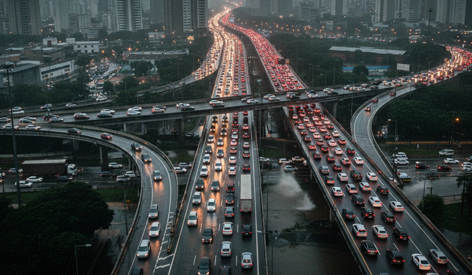 Chuva intensa provoca maior congestionamento de 2026; zonas leste, oeste, sul, sudeste e centro ficaram em estado de atenção.
