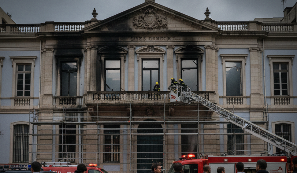 Chamas consumiram parte do telhado do antigo Palácio do Comércio; não houve vítimas e prédio deve ser interditado
