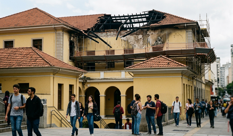Incêndio atingiu apenas parte do mezanino e não causou danos estruturais ou ao acervo histórico; alunos serão realocados