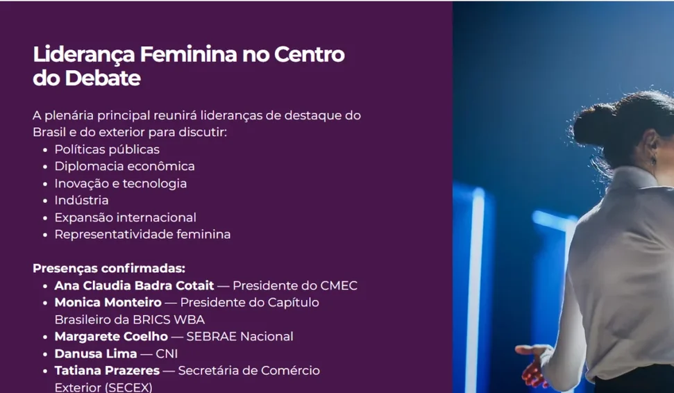 A plenária reunirá lideranças de destaque do Brasil e do exterior para discutir políticas públicas, inovação, diplomacia econômica, indústria, tecnologia e expansão internacional. Entre os nomes confirmados estão Ana Claudia Badra Cotait, presidente do CMEC; Monica Monteiro (Presidente do capítulo brasileiro BRICS WBA); Margarete Coelho (SEBRAE Nacional); Danusa Lima (CNI); e Tatiana Prazeres (Secretária de Comércio Exterior SECEX).