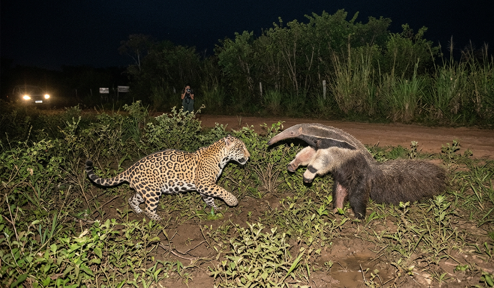Vídeo registra raro confronto entre onça-pintada e tamanduá no Pantanal