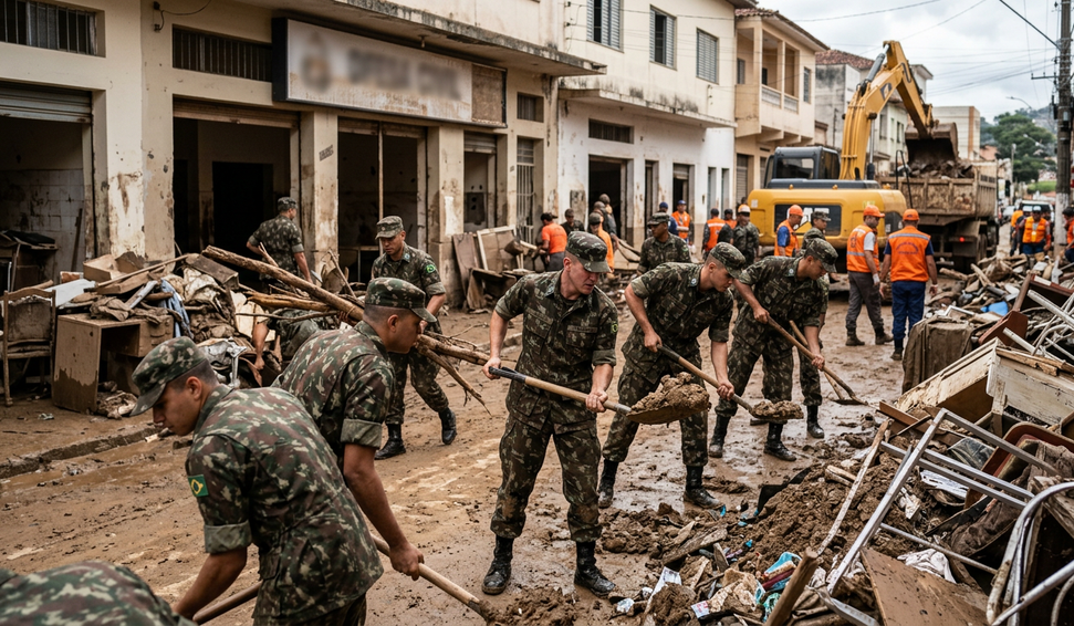 Dezenas de militares do Exército brasileiro seguem em Ubá, na Zona da Mata mineira, colaborando nas ações de limpeza após as inundações que atingiram a cidade na última terça-feira (24).