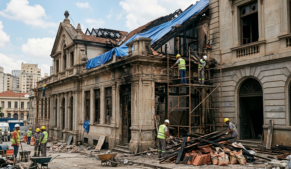 Restauro do Palácio do Comércio, na Sé, começa após incêndio atingir mezanino; órgãos de preservação aprovaram obras emergenciais.