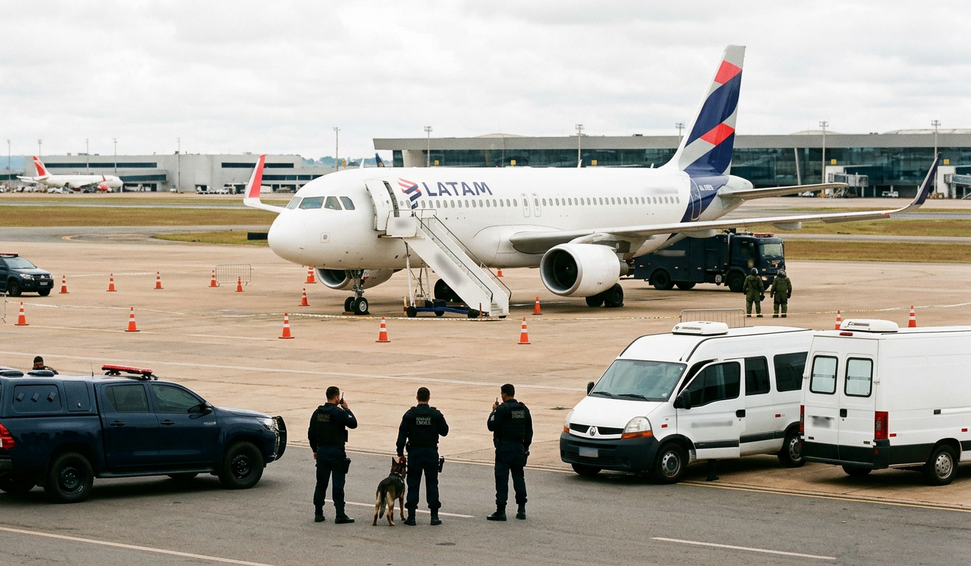 "Equipes especializadas da PF realizaram inspeções na aeronave, bem como em passageiros e em bagagens, com o objetivo de verificar a existência de eventual risco à operação aérea", informou a Polícia Federal em nota. Após a verificação, a corporação afirmou não ter identificado riscos ou irregularidades.