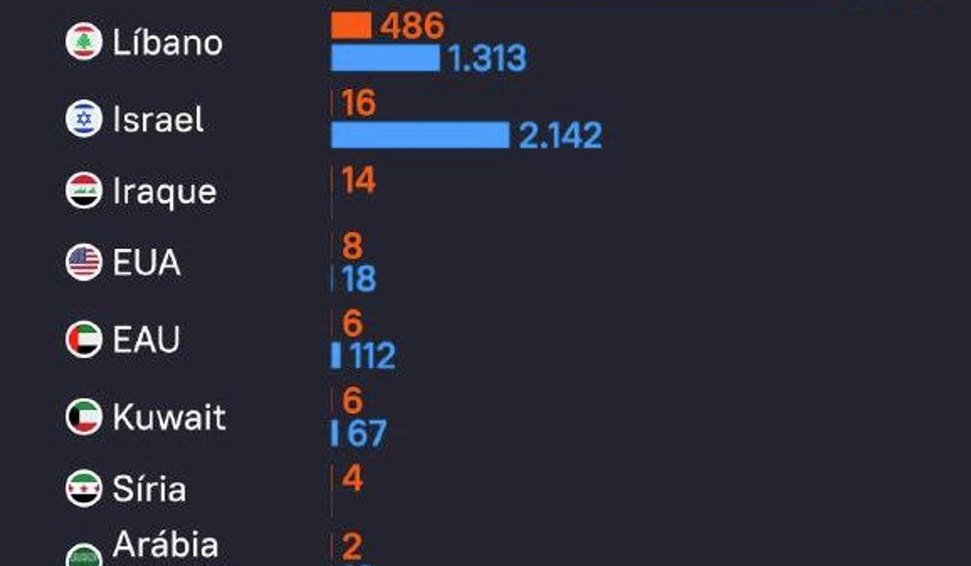 Infográfico detalha os dados atualizados sobre vítimas após ofensiva militar contra o Irã nesta segunda-feira (9)