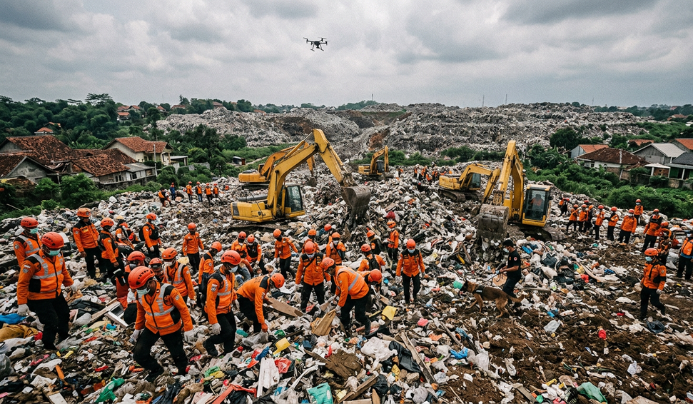 Fortes chuvas provocaram deslizamento em Bantar Gebang, maior aterro do país, mobilizando mais de 200 socorristas nas buscas.