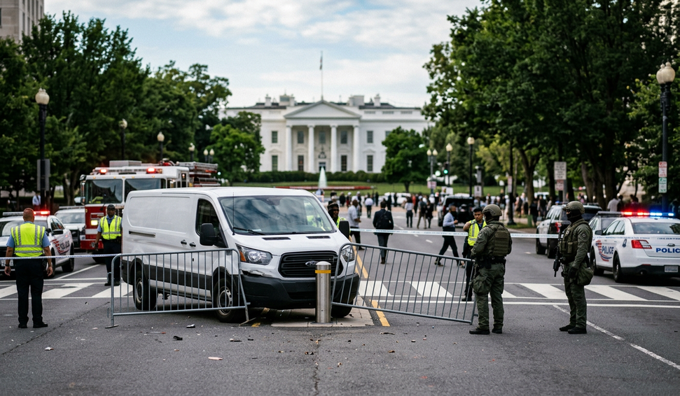 Uma van colidiu na manhã desta quarta-feira, 11, contra uma barreira de segurança próxima à Casa Branca, levando ao fechamento do perímetro no centro de Washington durante o horário de pico, conforme informou a polícia local.