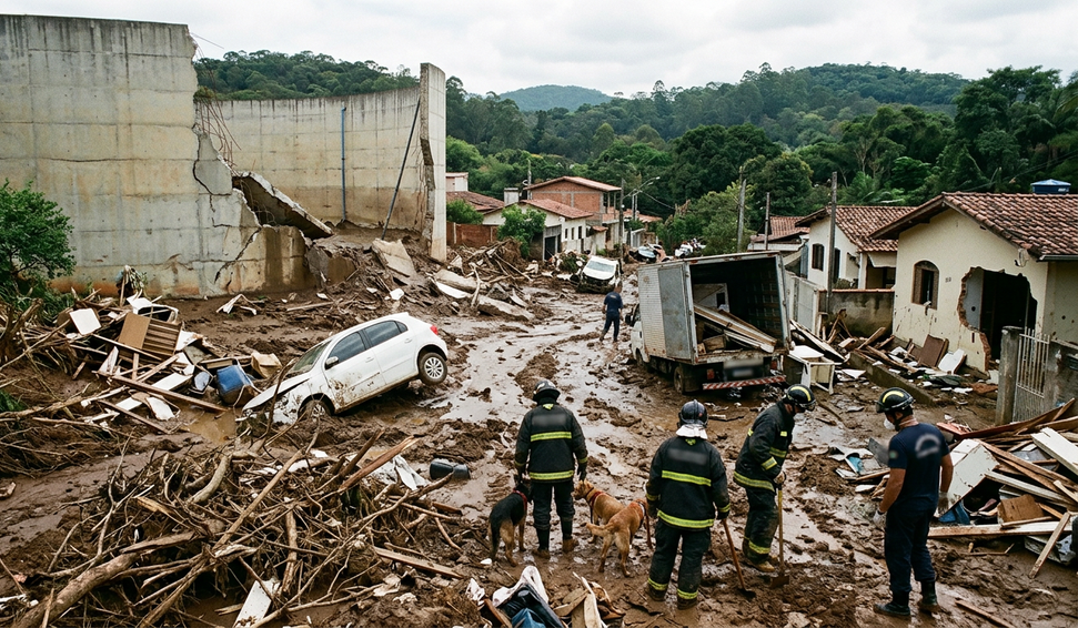 Estrutura de água colapsou na manhã desta quarta-feira, atingindo casas e veículos; equipes de resgate atuam no local.