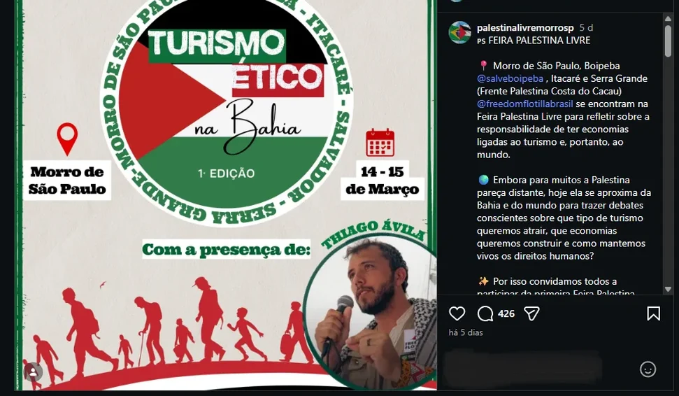 Para Frankenthal, no entanto, a iniciativa levanta preocupações relevantes. “Quando um evento sobre turismo inclui uma ‘Feira Palestina Livre’, é legítimo perguntar qual é a relação direta entre essa pauta e a atividade turística local. Se a proposta fosse apenas discutir sustentabilidade ou turismo responsável, por que introduzir um elemento político ligado a um conflito internacional? Esse tipo de associação levanta dúvidas sobre se o objetivo real é promover debate turístico ou direcionar hostilidade contra visitantes de determinada nacionalidade”, afirma.