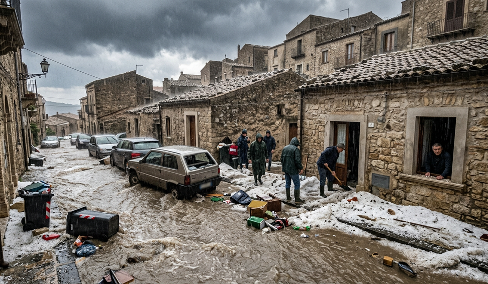 Aci Sant’Antonio, na Sicília, foi atingida por uma intensa tempestade de granizo acompanhada de enchentes nesta segunda-feira (data a ser inserida), provocando alagamentos e transtornos em diversas áreas do município italiano.