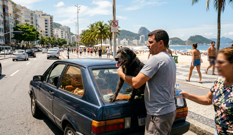 Um cachorro foi resgatado após ser abandonado dentro de um carro estacionado sob o sol na orla de Copacabana, zona sul do Rio de Janeiro. Moradores perceberam o animal arranhando o vidro do veículo, que estava parado há mais de uma hora, e acionaram agentes da Secretaria Municipal de Ordem Pública.