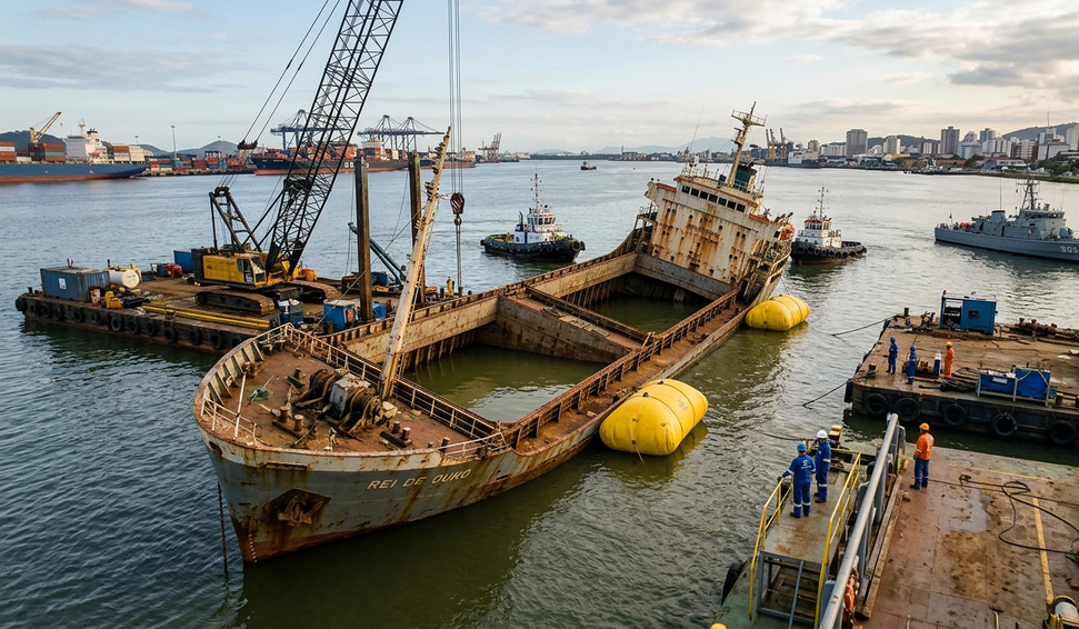 Navio histórico que afundou parcialmente em Santos será içado; Marinha investigará causas