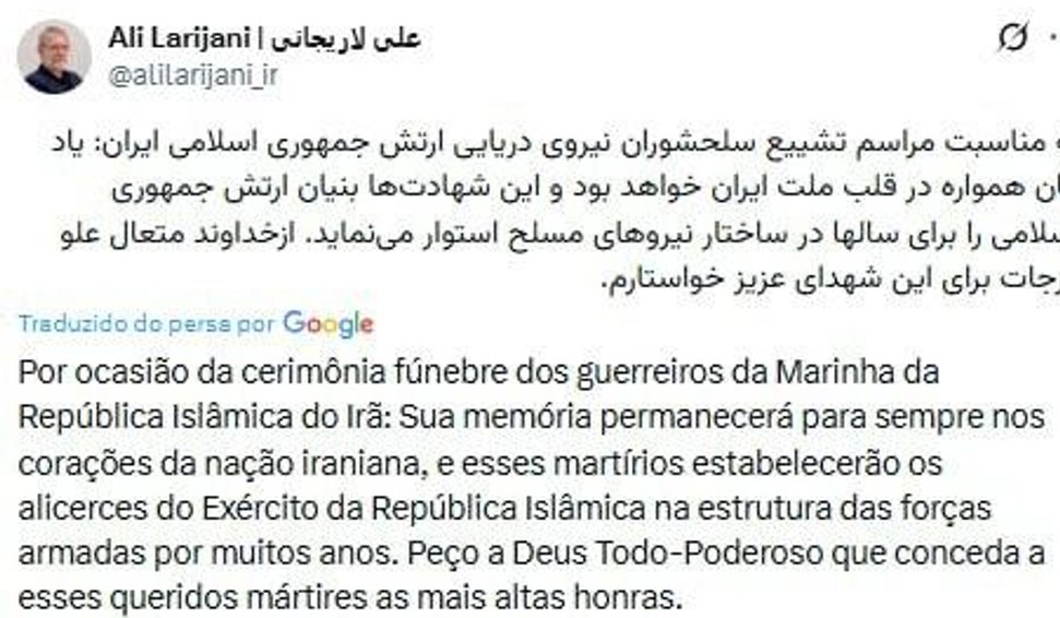 Ali Larijani, ex-presidente do Parlamento do Irã, se manifestou publicamente após Israel divulgar informações sobre sua suposta morte. Em resposta, Larijani publicou uma mensagem de condolências na rede X (antigo Twitter), direcionada às famílias dos marinheiros iranianos mortos no recente naufrágio da fragata Dena.