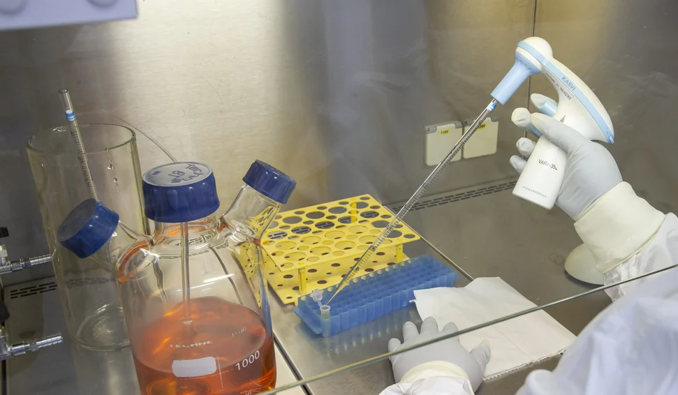 A farmacêutica inicia o desenvolvimento produtivo da vacina em cultivos de bancada, utilizando células de mamíferos que depois são infectadas com o vírus. A partir desses ensaios iniciais, o processo evolui para o scale-up, no qual os volumes de cultivo são ampliados gradualmente até atingir a escala necessária para produzir um lote com número suficiente de doses. Concluída a etapa de cultivo, acontecem as fases de inativação viral, purificação, formulação e envase — etapas que resultam no produto vacinal final.