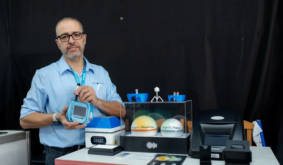 Uma dessas startups é a DUO PhageDx. Fundada em 2025, apresentou na feira um kit inovador de diagnóstico rápido que utiliza bacteriófagos para identificar patógenos, como a Salmonella. É uma solução que simplifica o processo analítico, traz agilidade para a cadeia produtiva e reduz riscos sanitários.