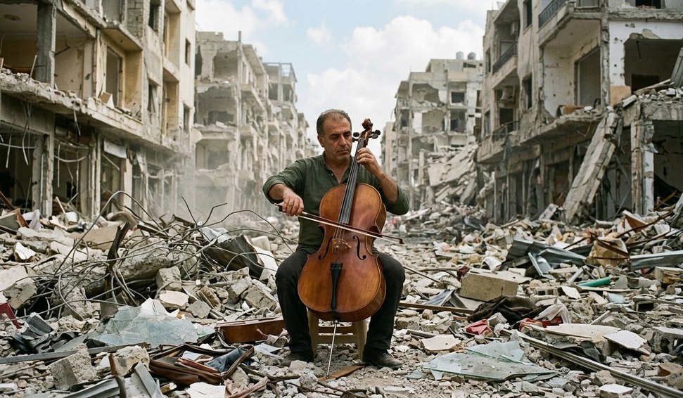Mahdi Saheli, violoncelista libanês, viralizou nas redes sociais ao ser filmado tocando a peça "Andantino", do compositor soviético Aram Khachaturyan, em meio aos destroços provocados pelos bombardeios israelenses no sul de Beirute.