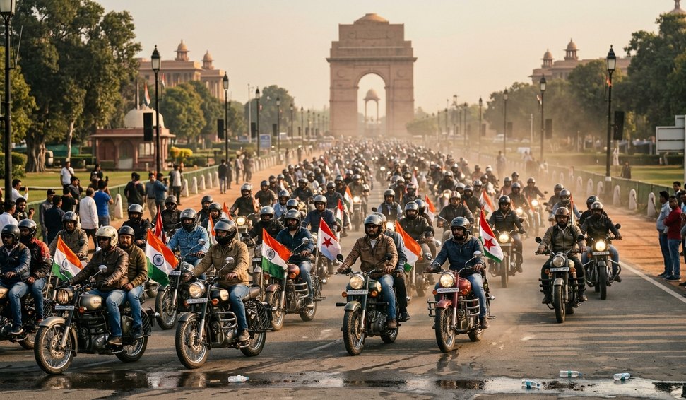 Uma marcha com mais de 400 motociclistas da Índia e de outros dez países saiu da Embaixada da Rússia e seguiu até o centro cultural Casa Russa neste sábado (21), em Nova Deli.