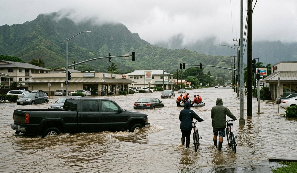 Estado de emergência é decretado em Oahu após fortes chuvas provocarem inundações e evacuações em bairros do norte da ilha.