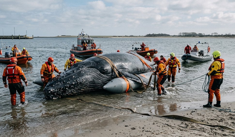 Drama no Báltico: operação tenta salvar baleia‑jubarte encalhada no norte da Alemanha