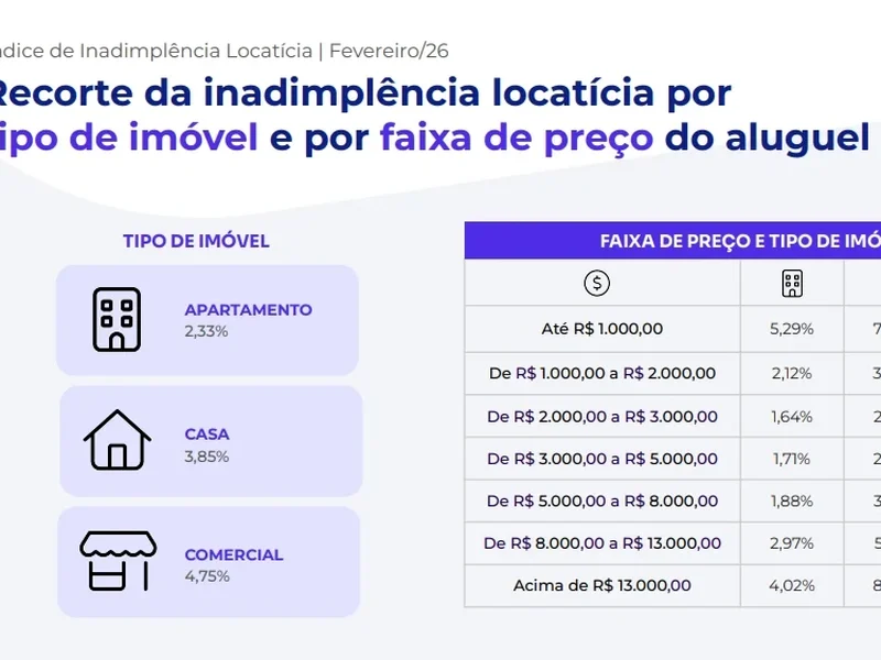 Entre a base analisada, a inadimplência em imóveis residenciais de alta renda (na faixa de aluguel acima de R$ 13.000), que esteve no topo das taxas mais altas durante 2025, teve alta expressiva de 3,81 ponto percentual, em fevereiro, com média de 8,58% contra 4,77%, em janeiro. Já os imóveis na faixa de até R$ 1.000, que registraram a maior taxa no mês passado no segmento residencial, subiram 1,32 ponto percentual, saindo de 5,76% para 7,08%, em fevereiro. A inadimplência de imóveis de R$ 2.000 a R$ 3.000 e R$ 3.000 a R$ 5.000 foram as mais baixas do período, com taxas de 2,78% e 2,89%, respectivamente.
