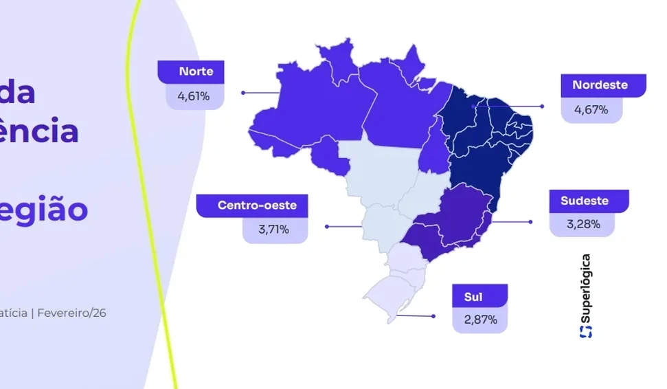 Em janeiro, a região Nordeste voltou ao topo do ranking de inadimplência, com uma taxa de 4,67%, alta de 0,71 ponto percentual em relação a janeiro (3,96%). Já o Norte, no topo no mês passado, ficou em segundo lugar, com 4,61%, alta de 0,58 ponto percentual, ante os 4,03% de janeiro. A região Centro-Oeste marca o terceiro lugar com 3,71%, um recuo de 0,43 ponto percentual, após os 3,28% do mês anterior. O Sudeste aparece em seguida, com taxa de 3,28% – alta de 0,12 ponto percentual em relação a janeiro –, e o Sul com 2,87%, mantendo a menor taxa do país, apesar da alta de 0,39 ponto percentual entre janeiro e fevereiro.