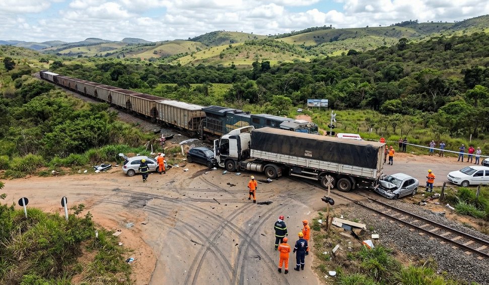 Carreta é atingida por trem e provoca colisão com carros em Minas Gerais