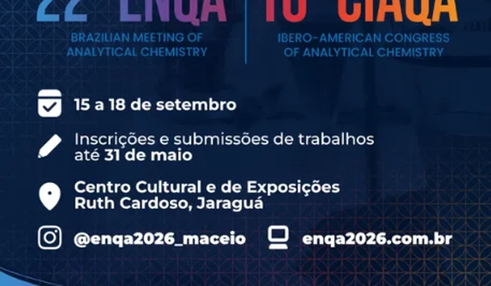 A Universidade Federal de Alagoas (Ufal) e a Sociedade Brasileira de Química (SBQ) realizam, de 15 a 18 de setembro de 2026, em Maceió, o 22º Encontro Nacional de Química Analítica (ENQA 2026). As inscrições para participação e submissão de trabalhos estão abertas até 31 de maio, por meio do site oficial do evento.