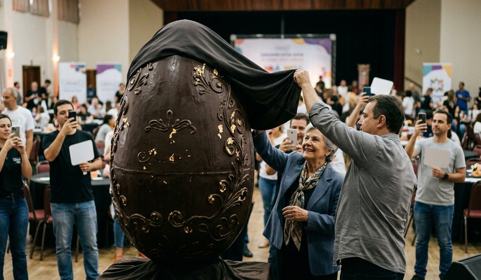 - O Protagonista: Um ovo de chocolate de 700 kg, além de versões de 70 kg e 7 kg.