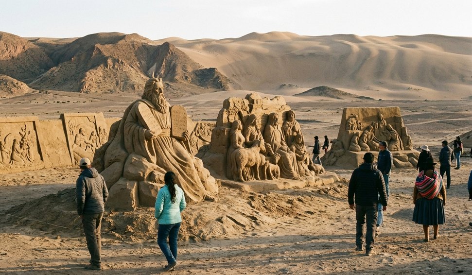 Mais de 300 artistas se reuniram na cidade de Oruro, na Bolívia, para criar gigantescas esculturas de areia inspiradas em passagens bíblicas nas dunas do deserto local.