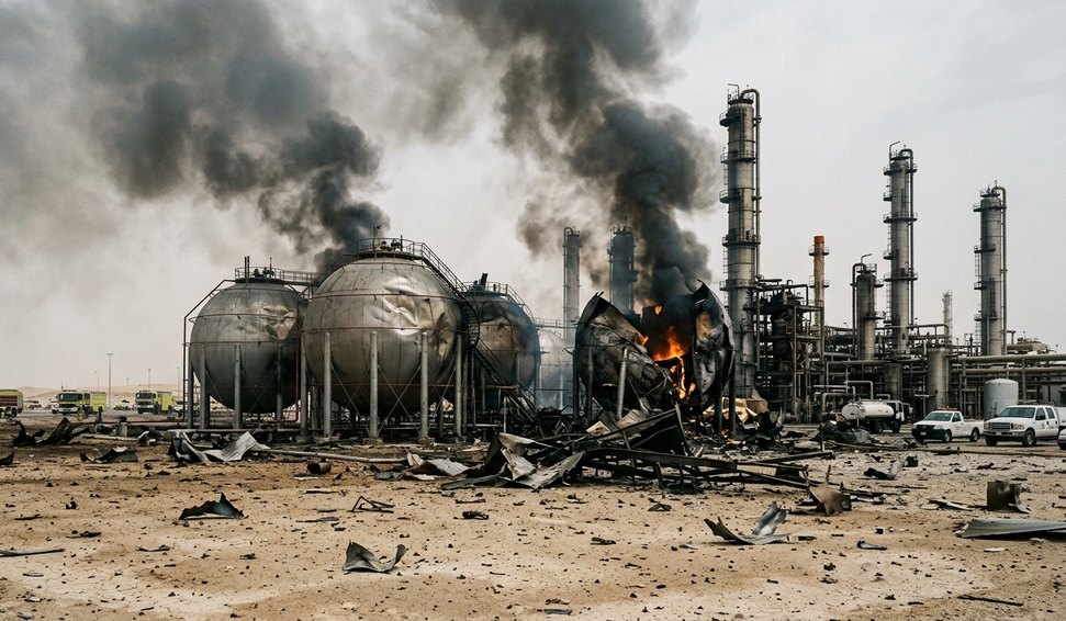 Foguete Patriot, fabricado nos Estados Unidos, explode em instalação petrolífera barenita após suposto erro operacional durante ataque iraniano.
