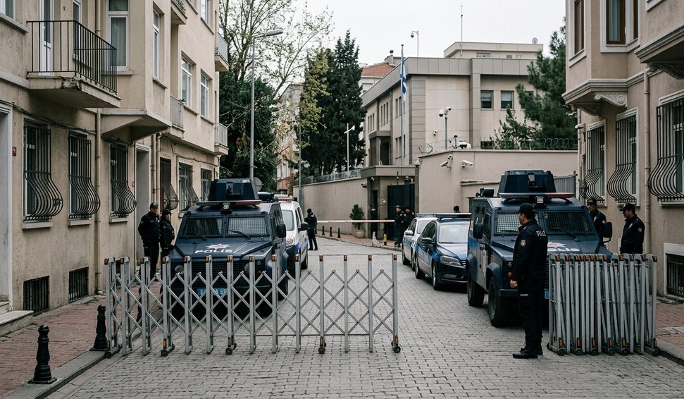 Forças de segurança mantêm bloqueios e reforçam presença nos arredores do consulado-geral de Israel, no bairro de Levent.