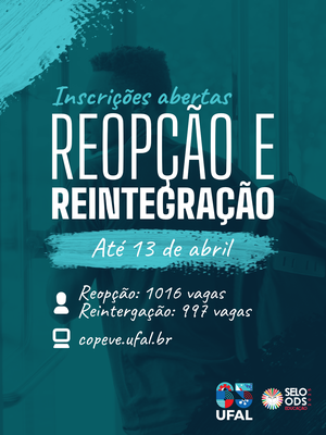 A Universidade Federal de Alagoas, por meio da Pró-Reitoria de Graduação (Prograd) e do Departamento de Registro e Controle Acadêmico (DRCA), juntamente com a Gerência de Registros Acadêmicos (GRCA) e as Coordenações de Registros Acadêmicos (CRCAs), publicou dois novos editais que abrem processos seletivos para ocupação de vagas ociosas na graduação no semestre letivo de 2026.2. As seleções são voltadas para estudantes da própria universidade e contemplam as modalidades de reopção de curso e reintegração. Os editais estão disponíveis no site da Copeve/Ufal.