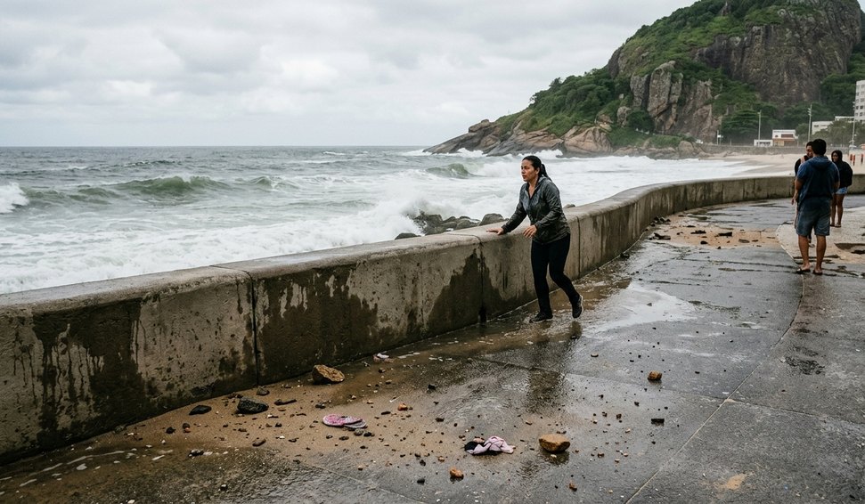 Uma onda de grande intensidade surpreendeu frequentadores da mureta do Leme, na Zona Sul do Rio de Janeiro, na manhã desta sexta-feira (10). A força da água arrastou uma mulher, que felizmente não sofreu ferimentos.