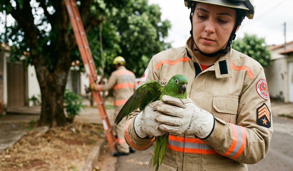 Militares do Corpo de Bombeiros de Minas Gerais resgataram uma maritaca ferida, vítima de linhas cortantes utilizadas em pipas. A equipe do 5º Batalhão realizou os primeiros socorros, aplicando curativos no animal antes de encaminhá-lo para um centro veterinário especializado, onde receberá tratamento adequado.
