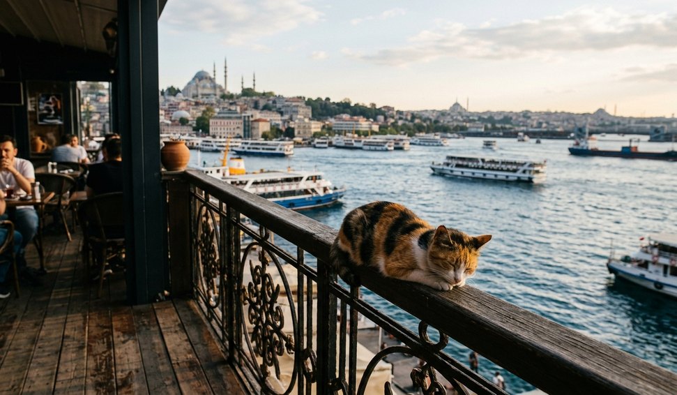 Gato aproveita cochilo relaxante com vista para o Bósforo em Istambul