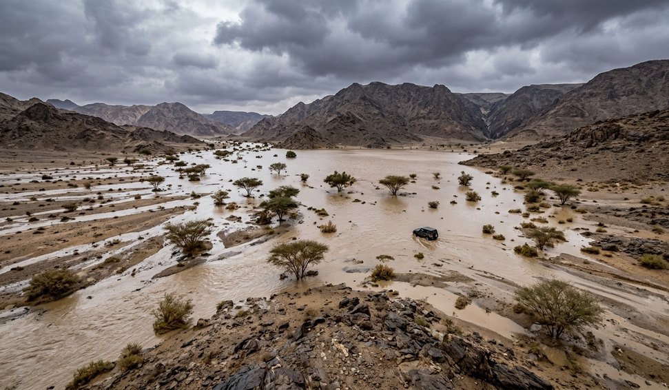 Chuvas intensas causam inundações e transformam paisagem árida na Arábia Saudita