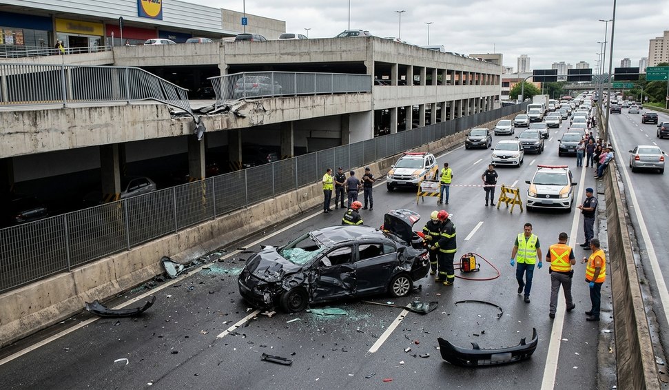 Motorista morre após carro despencar de estacionamento de supermercado e cair em rodovia