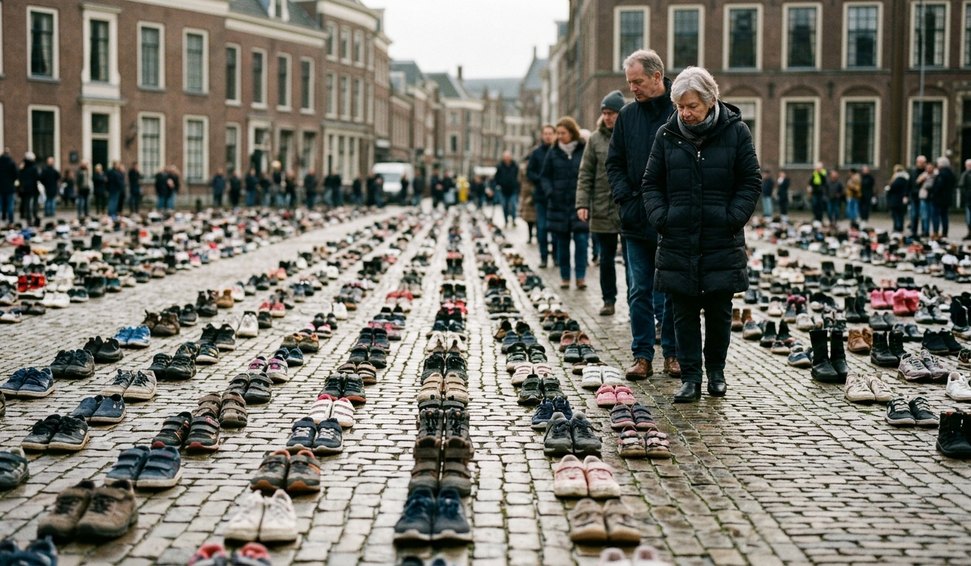 Milhares de sapatos e brinquedos infantis foram dispostos na Praça Dam, em Amsterdã, em um tributo comovente às crianças mortas em Gaza após ataques de Israel.