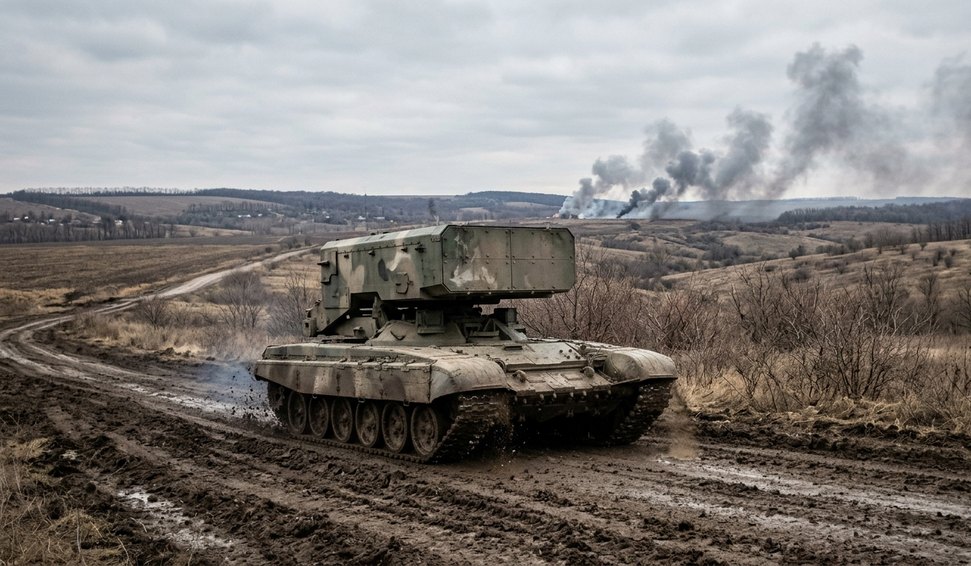 Sistema de lança-chamas russo Solntsepek é utilizado contra posições inimigas em Krasny Liman