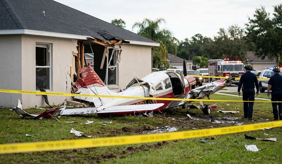 Aeronave de pequeno porte caiu no quintal de uma casa perto de Tampa e provocou incêndio; investigação está em andamento.