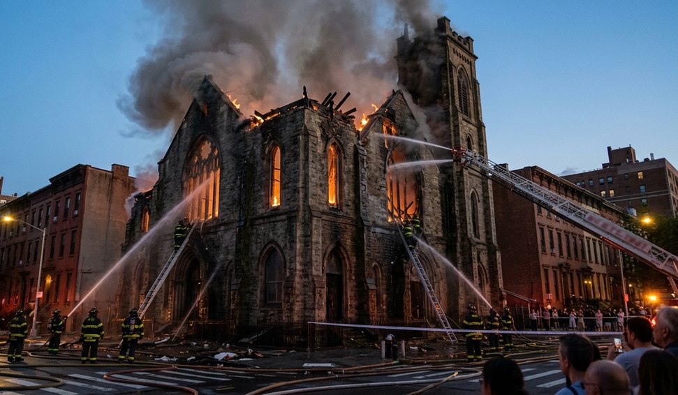 Incêndio de grandes proporções atinge igreja histórica em Nova York