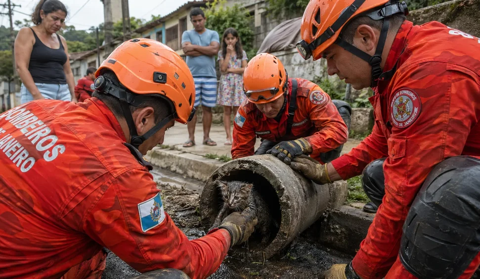 Equipes do Corpo de Bombeiros Militar do Estado do Rio de Janeiro resgataram um filhote de gato que ficou preso em uma tubulação de captação de água na rua Vereador José Elias Zaquem, em Teresópolis, na Região Serrana do Rio de Janeiro.