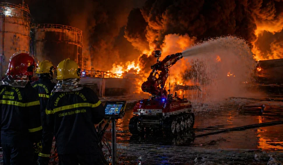 Um incêndio de grandes proporções atingiu, na noite de sábado (25), um depósito de óleo usado localizado no vilarejo de Loc Ha, em Hanói, capital do Vietnã, conforme informações da mídia local.