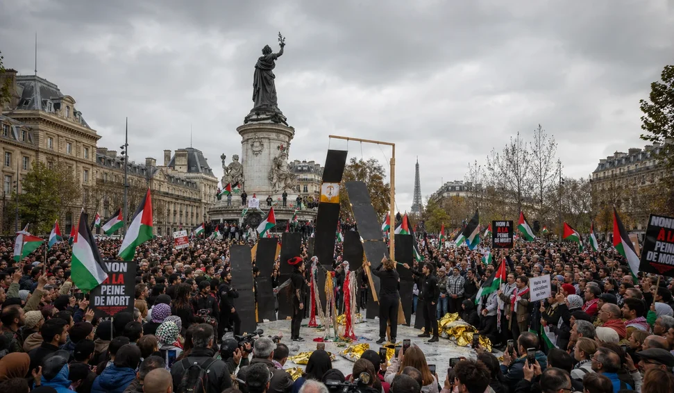 O ato, realizado por defensores dos direitos dos palestinos, criticou a lei aprovada em Israel no final de março, que estabelece o enforcamento como punição padrão para crimes classificados como terrorismo "com o objetivo de negar a existência do Estado de Israel". Na prática, a medida atinge exclusivamente palestinos.