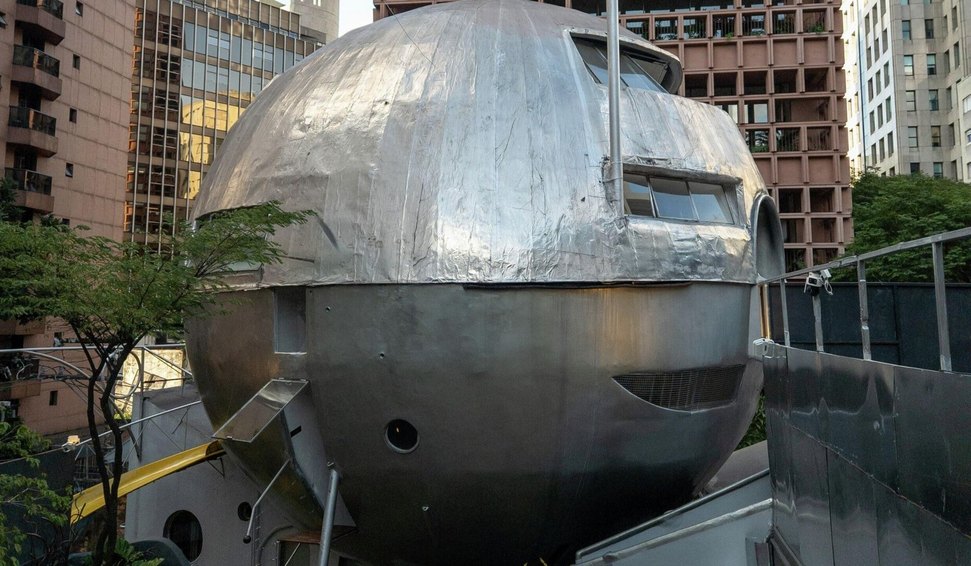 Num cruzamento estranho entre a estética Flintstones e Jetsons, como a define a curadora Kiki Mazzucchelli, uma esfera branca paira sobre os telhados da Avenida Brigadeiro Faria Lima, em São Paulo (SP), como se tivesse pousado ali de outro tempo.