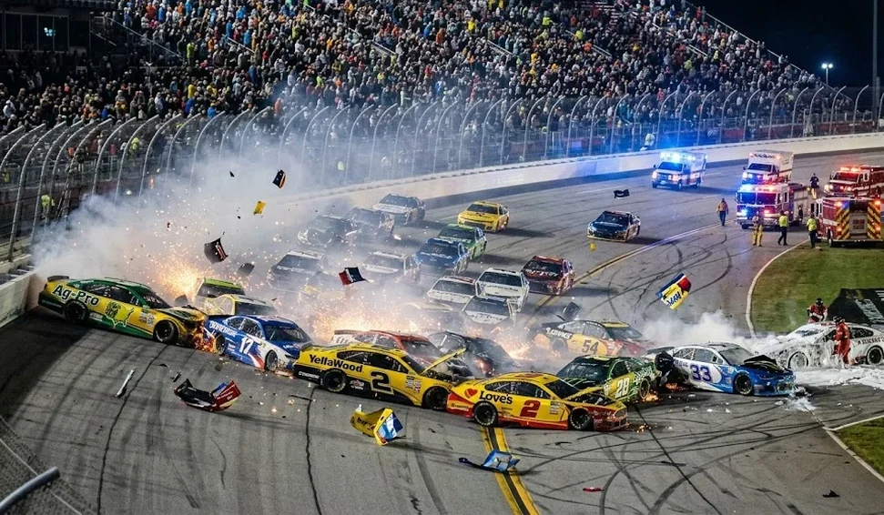Uma questão envolvendo 27 veículos iniciou uma corrida automobilística neste domingo (26), no estado do Alabama, Estados Unidos. O acidente teve início quando o carro do líder derrapou e colidiu com o muro, desencadeando uma sequência de golpes entre os concorrentes.