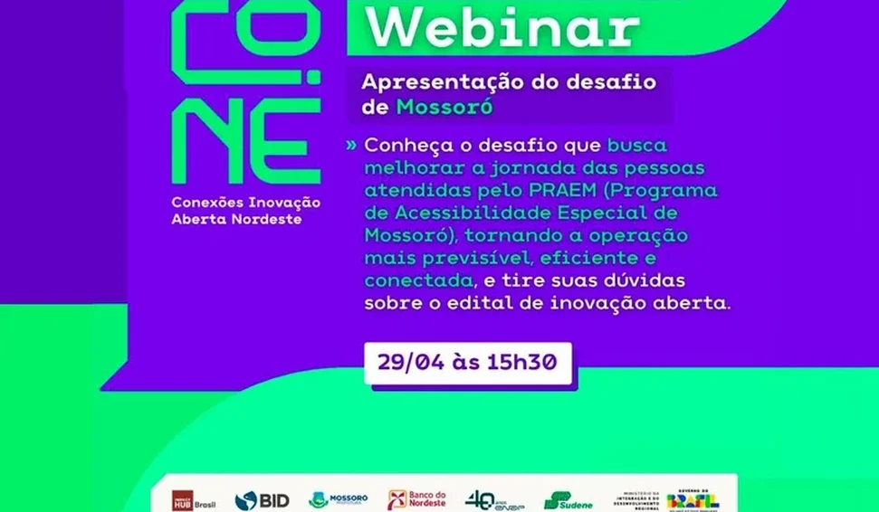 Recife (PE) – As startups interessadas em apresentar soluções para o desafio de inovação aberta voltado ao aprimoramento do Programa de Acessibilidade Especial de Mossoró (PRAEM) podem tirar dúvidas durante webinar nesta quarta-feira (29), às 15h30. A iniciativa faz parte do programa Conexões Inovação Aberta Nordeste (Co.NE), uma parceria da Superintendência do Desenvolvimento do Nordeste (Sudene) com a Escola Nacional de Administração Pública (Enap), o Banco do Nordeste (BNB), o Banco Interamericano de Desenvolvimento (BID) e o Impact Hub Brasil.